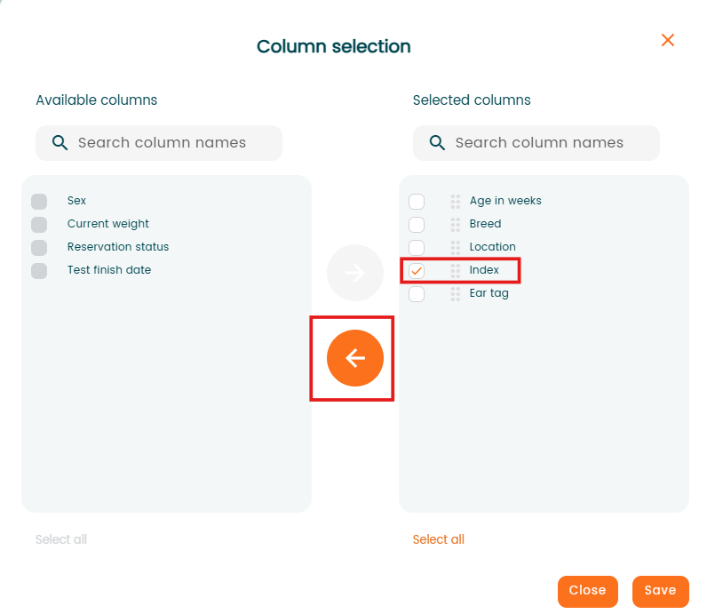 The panel on the right displays the columns currently visible in the report. To remove columns, select them and move them to the left (in this example we remove Index):