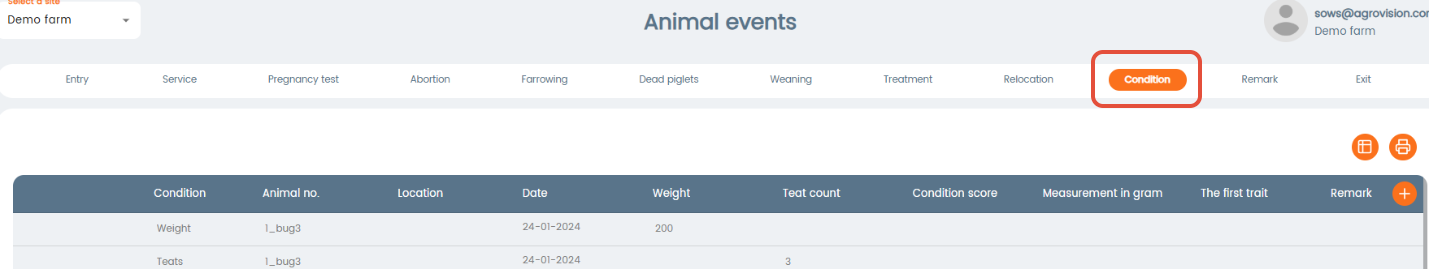 All conditions registered on a sow will be also visible on an animal card by selecting Conditions icon on the bottom.