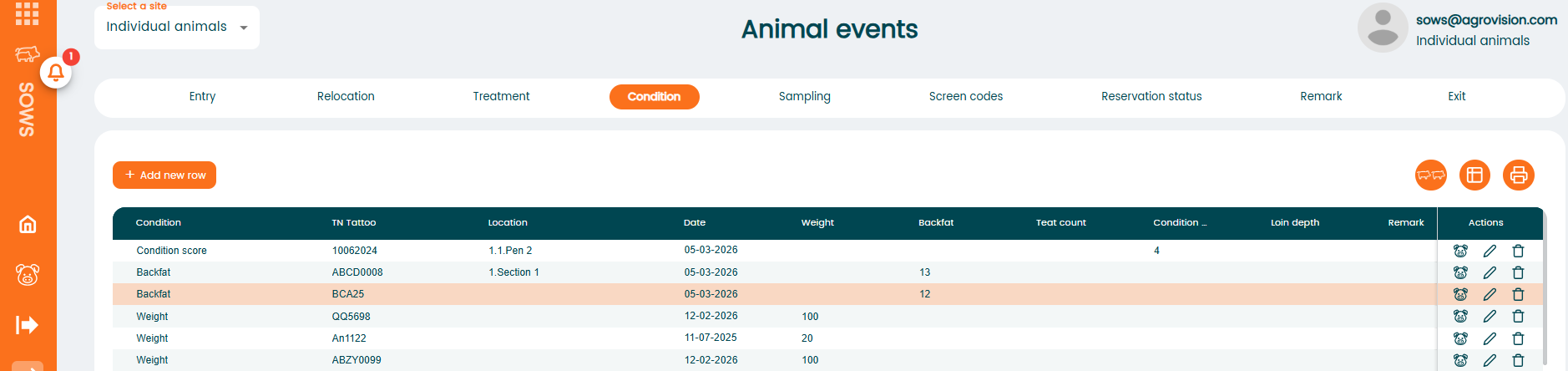The worklist will display animals that meet the criteria, and you can fill in a "Condition" by clicking on a line, entering the data, and saving it.