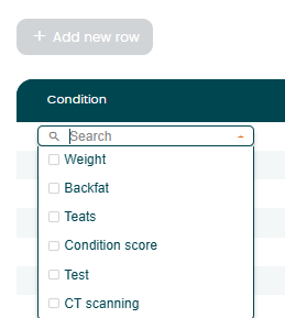 Click "+Add new row" to enter new condition. A new line will appear. Select "Condition" from the list.