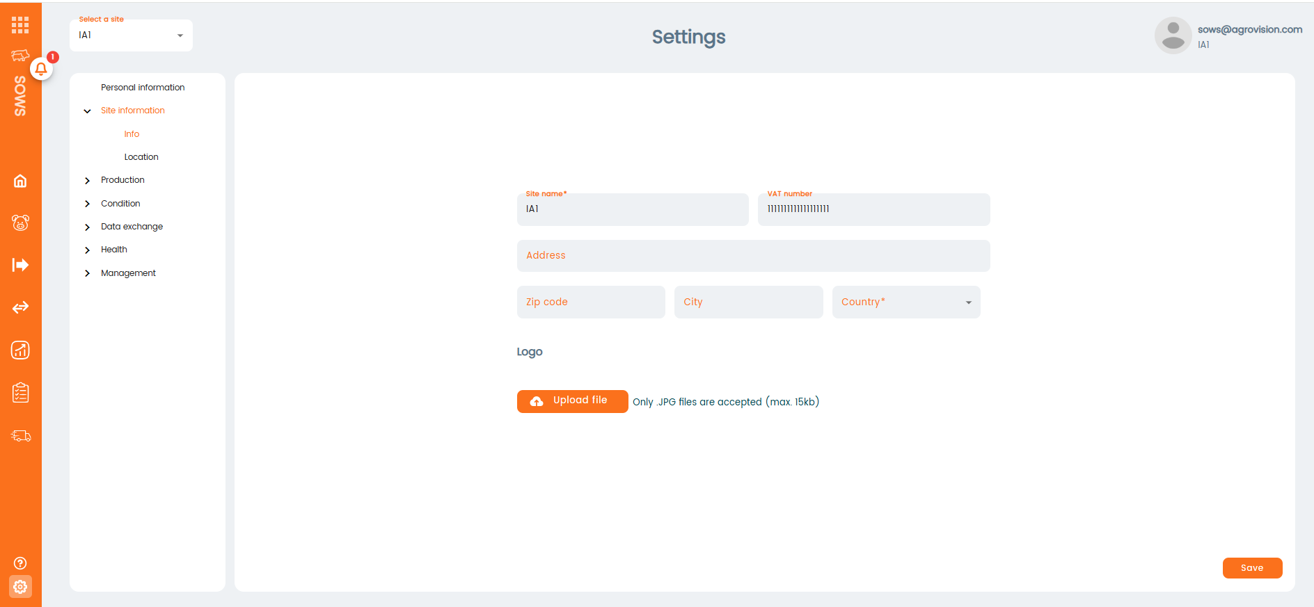 Site information: in this section you will go through 2 screens. First one will be site information, where you need to fill name, VAT number and again, choose the country