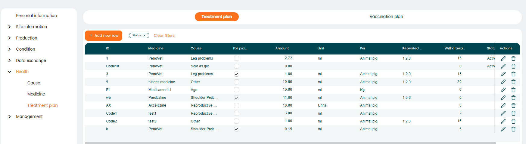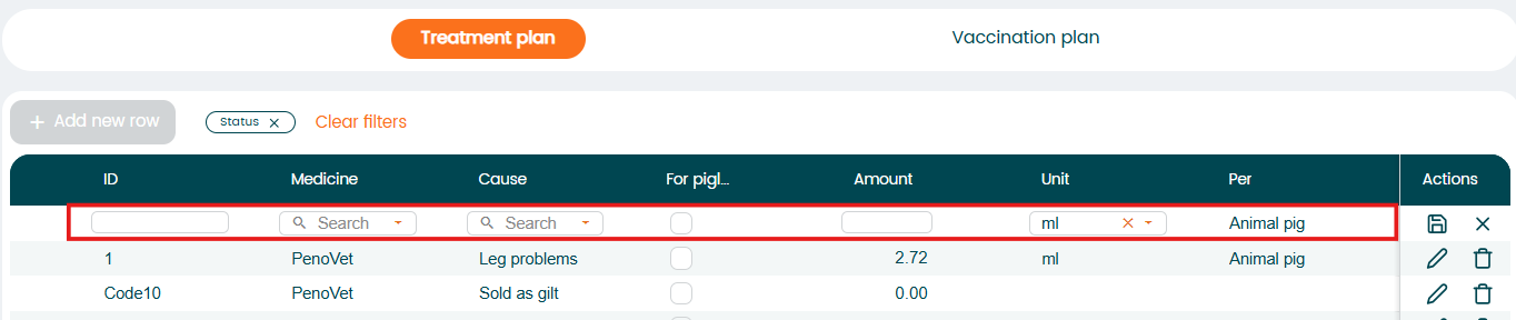 - "For piglets": Decide whether the treatment plan applies for piglets by adding/removing the check mark.