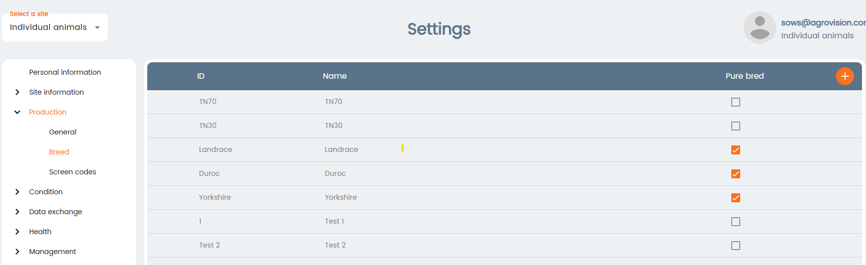 Set up the breeds you use. For purebred animals, select the Pure bred checkbox. When finished, click the Save icon.
