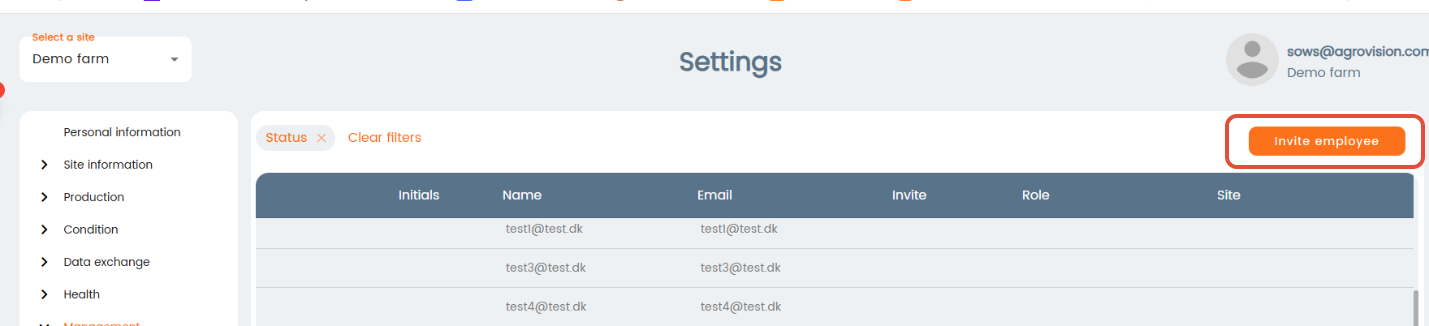 The "Employee" section is to invite and register new employees and give them rights to use the program. You can create/invite a new employee by clicking on the "Invite employee" button. Once you click there you will fill in his/her email and they will receive a notification in their mail inbox for activating their account. Until they activate their account this new employee's status will be "Pending". Once they complete the activation their status will be "Active". You can also delete employees while their status is Pending. To delete approved employee, you can do it in MyAgrovision.