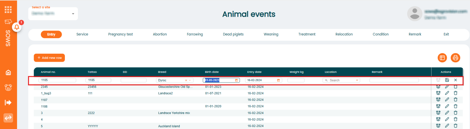 First, select the event type you want to register. Click on the event tab (for example Entry) at the top of the page. Click the “+ Add new row” button located above the table. A new empty row will appear in the table where you can enter the information. Fill in the fields for the animal in the new row.