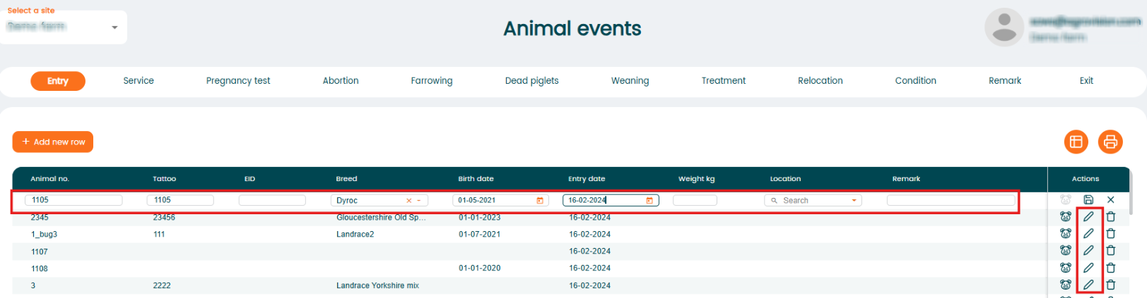 When you want to edit an existing registration go to the table where the registration you want to edit is saved. In this example we are editing an entry registration. We go to "Animal events" and select "Entry" to see all the entries. We click on the row we want to edit and it will automatically become editable. Alternatively, you can click the "pencil" icon in the "Actions" column to enable editing.