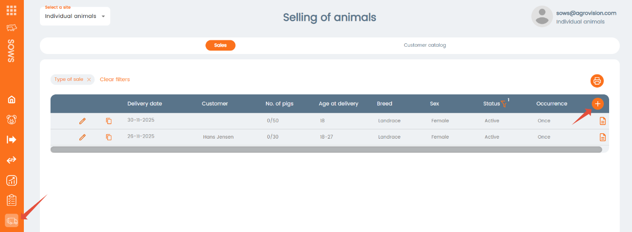 To create a new sale, go to the menu Selling of animals. Existing sales will be shown. To create a new sale click "+" on the right: