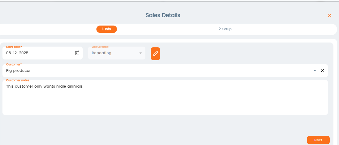 In the next window, the starting date will be shown and it will also be visible that it is a repeating sale. To correct the reoccurrence, click on the pencil next to Occurrence. Select customer and add customer notes if needed.