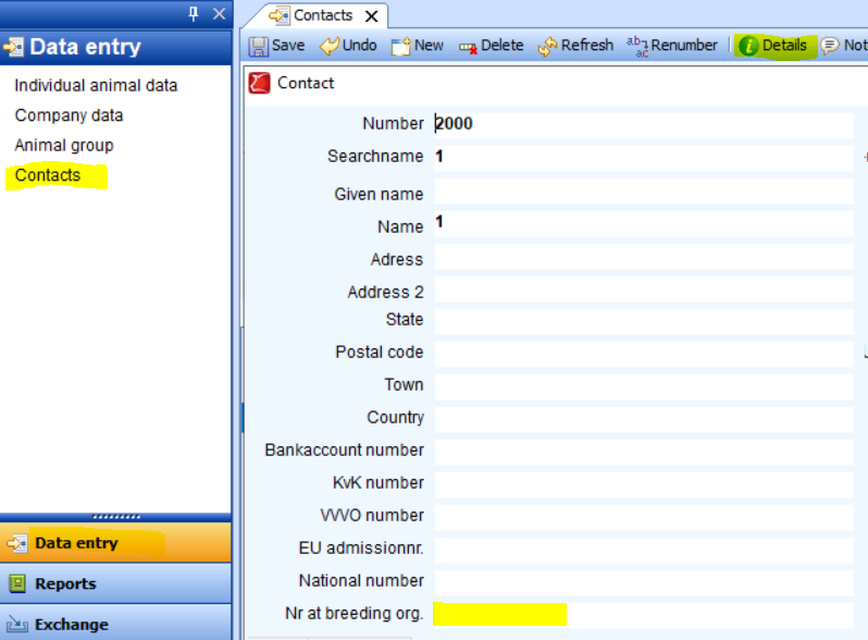 To add the PICtraq ID of the inseminator from the mating, go to “Data entry” → “Contacts,” select the contact you want to add, and press “Details.” Here you will find the field “No. at breeding org.” where you can enter the inseminator ID.