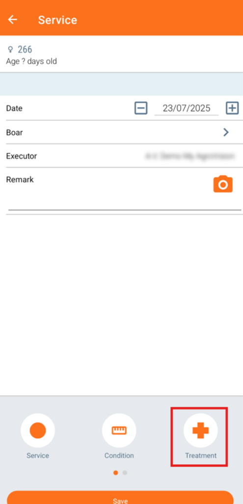 Treatments can also be registered from the main event for sows (service, farrowing or weaning) by tapping on the "Treatment" icon below the line on the data entry option.