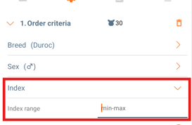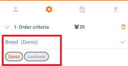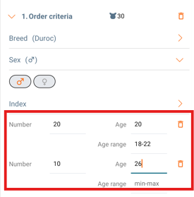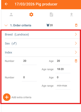 When creating "Order criteria" you set the criteria for age, breed, index and sex of the animals. One order criteria is automatically created and up to 5 other criteria can be added, by clicking "+ Add extra criteria".