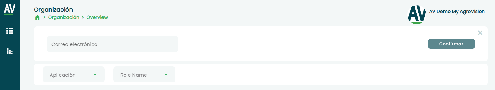 Para agregar usuarios a la organización, vaya a MyAgroVision.com, inicie sesión con la cuenta de su organización y desde la pantalla principal toque el botón Organización en el lado izquierdo de la pantalla. Se muestra con un círculo rojo en la imagen de abajo.