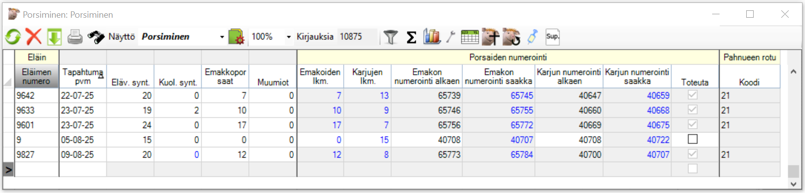 Porsaiden varsinainen numerointi voidaan tehdä porsimisen kirjausnäytöltä tai emakkokorteista.