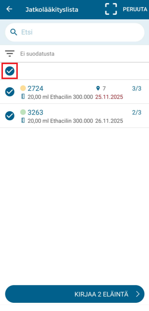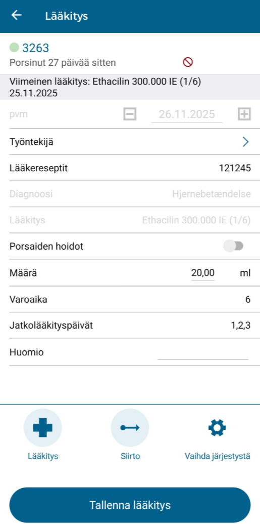 Lääkintä on jo tallennettu eläimelle, joten napsauta vain "Tallenna lääkitys". Jos emakolle ei ole enää jatkolääkityksiä, se katoaa listalta. Muussa tapauksessa emakko pysyy listalla, kunnes lääkitys on valmis.