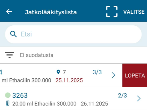 Tarvittaessa voit myös lopettaa eläimen jatkolääkityksen pyyhkäisemällä vasemmalle.