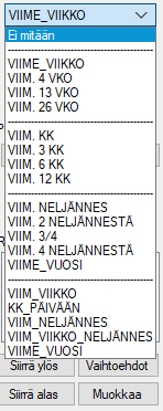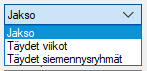 Toisessa avattavassa valikossa valitset, mille ajanjaksolle analyysi lasketaan. Jos valitset "Ei mitään", voit syöttää tietyt päivämäärät. Jos olet valinnut jaksolaskennassa "Täydet viikot" tai "Täydet siemennysryhmät", ohjelma korjaa päivämäärät vastaavasti.