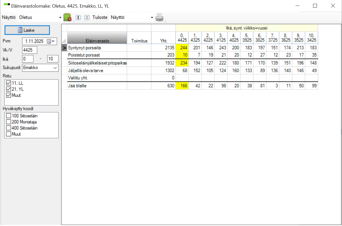Sitten näytetään niiden eläinten lukumäärä, joista olet tehnyt toimitussopimuksia tai luonut niitä. Tämä antaa sinulle käytettävissä olevien eläinten lukumäärän, joille voit luoda lähetyslistoja. Jos olet valinnut ylimääräisiä eläimiä lähetyslistaa varten, ne näkyvät erillisellä rivillä. Rivi "Käytettävissä olevat siitoseläimet" näyttää, kuinka monta eläintä on valittavana. Kaikki tämä on jaettu ikään viikoissa ja syntymäviikkoon.