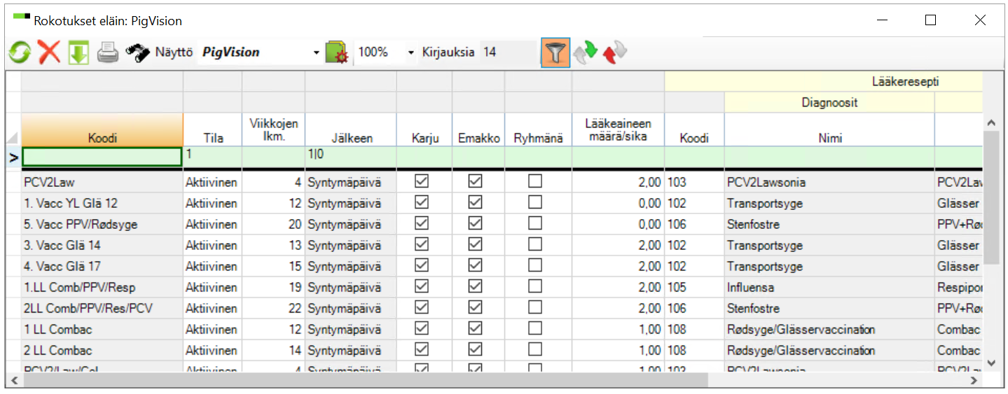 Tähän syötät oman rokotusohjelman koodisi, valitset sitten, minkä ikäisenä eläin rokotetaan (viikkoina), laitat rastin kohtaan Karju ja/tai Emakko, jos molemmat on rokotettu tällä, syötät annostuksen ja valitset sitten lääkereseptin. Voit etsiä oikean lääkereseptin F5-näppäimellä.