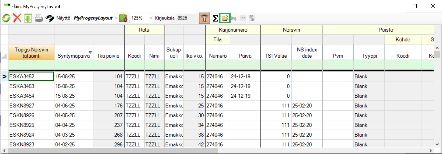 Tuo sähköinen lähetyslista napsauttamalla "Siitoseläinten jälkeläiset" -ikkunan yläosassa olevaa "Tuo"-kuvaketta, joka näkyy vihreänä neliönä alla olevassa kuvassa.