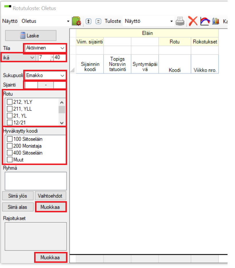Valitse "Aktiiviset" eläimet iältään 0–80 viikkoa. Koska luettelon tulisi näyttää sekä naaraat että urokset, kaikki rodut ja kaikki hyväksyntäkoodit, valitse "Sukupuoli"-kohdassa "Kaikki" ja merkitse kaikki tai ei mitään kohdissa "Rotu" ja "Hyväksyntäkoodi".