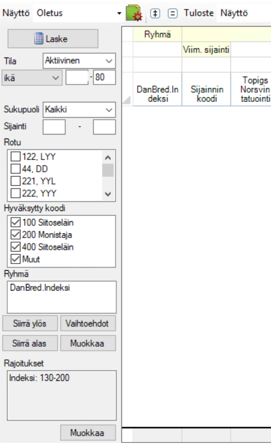 2. Valitse "Ryhmä"-kohdassa prioriteetiksi "DanBred-indeksi". Toinen prioriteetti on "Ikä viikkoina".