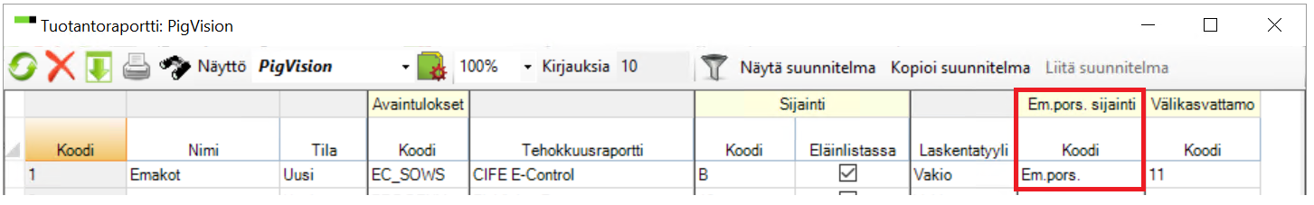 Tehokkuusraportin määrittämisen yhteydessä valitset emakkoporsaiden sijainnin, ja se on "emakkoporsaat (sijainti)".