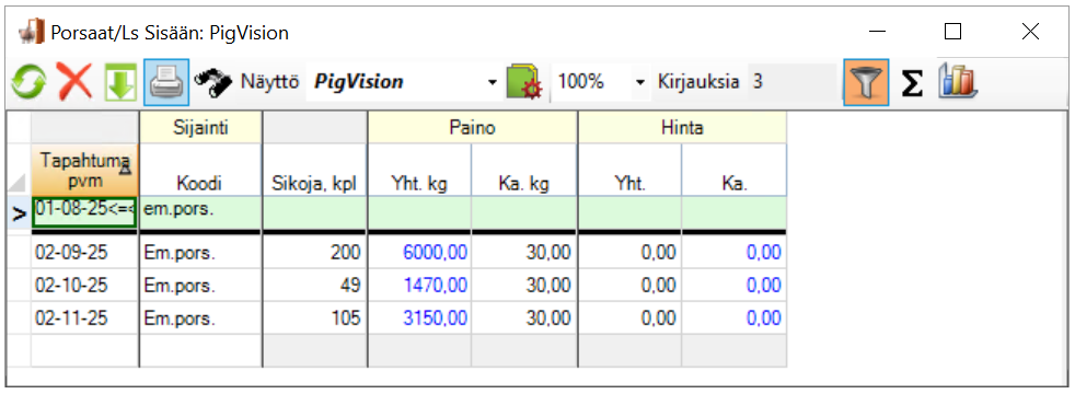 "Porsaat/Ls" - "Sisään" -kohdassa on asetettu suodatin Q4:lle kohdassa "Tapahtumapäivämäärä", ja emakkoporsaiden sijaintiin nimeltä "em.pors." on rekisteröity 3 merkintää.