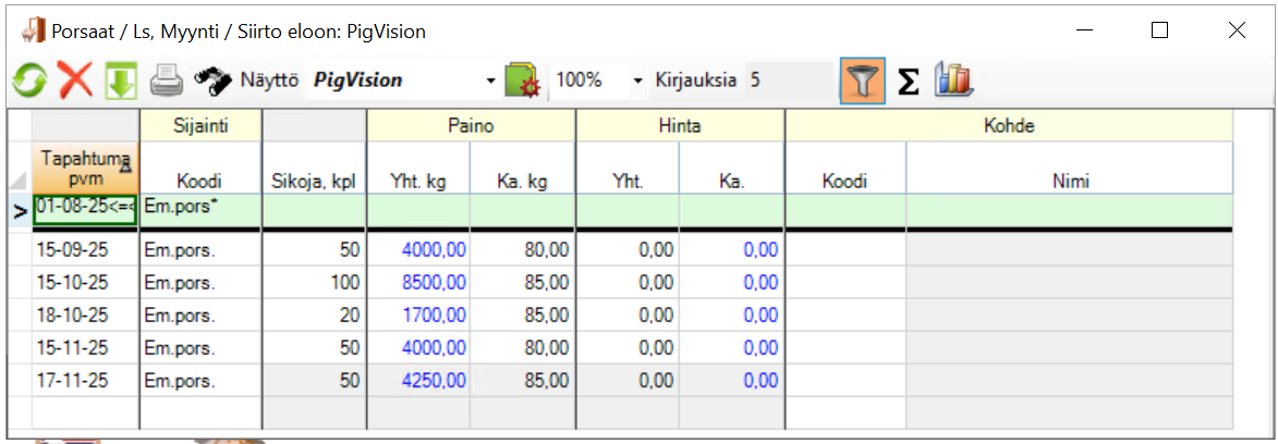 "Porsaat/Ls" - "Myynti /Siirto eloon" -kohdassa on asetettu suodatin Q4:lle kohdassa "Tapahtumapäivämäärä", ja emakkoporsaille "em.pors." on rekisteröity 5 poistoa.