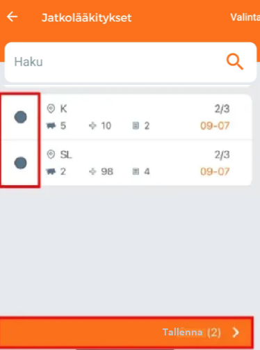 Tallentaaksesi jatkolääkityksiä napsauta tiettyä jatkolääkitystä. Jos haluat tallentaa useita jatkolääkityksiä kerralla, napsauta "Valitse" oikeassa yläkulmassa.