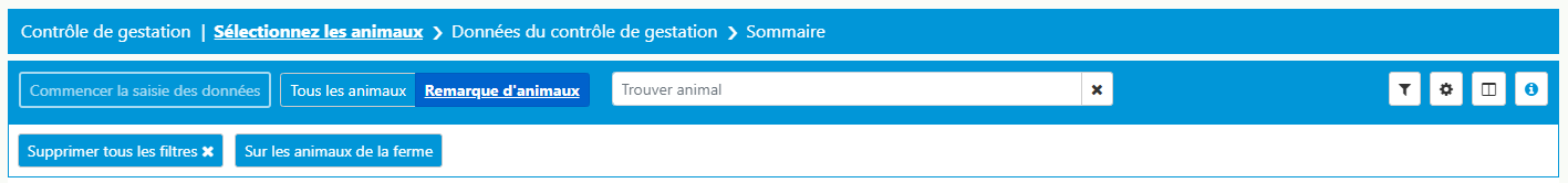 1. Sélectionnez l'animal ou plusieurs animaux pour lesquels vous souhaitez réaliser un contrôle de gestation. L'écran s'ouvre automatiquement sur Remarque d'animaux.