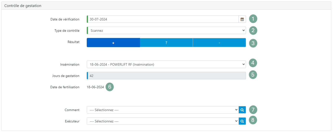 | 4. Insémination | Sélectionnez l'insémination. Le dernier insémination est automatiquement sélectionné. S'il s'agit d'un insémination précédent, vous pouvez la sélectionner ici. S'il s'agit d'un insémination qui n'a pas encore été rempli, vous pouvez sélectionner Nouvelle insémination dans le champ de saisie insémination. Cliquez ici pour plus d'informations. |