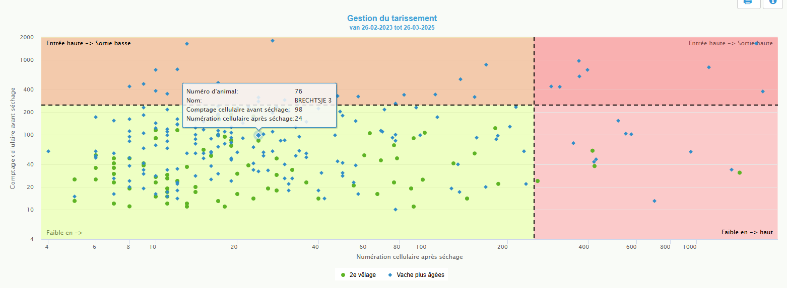 En passant la souris sur les figures (cercles, carrés), le numéro de l'animal, le nombre de cellules somatiques avant dessiccation et le nombre de cellules somatiques après dessiccation s'affichent. En cliquant sur l'une des quatre zones, les animaux qui s'y trouvent s'affichent. Il est possible d'imprimer cet aperçu ou de l'enregistrer au format PDF.