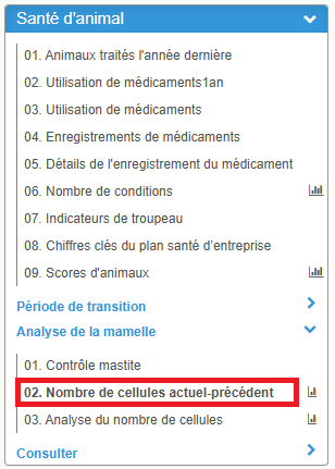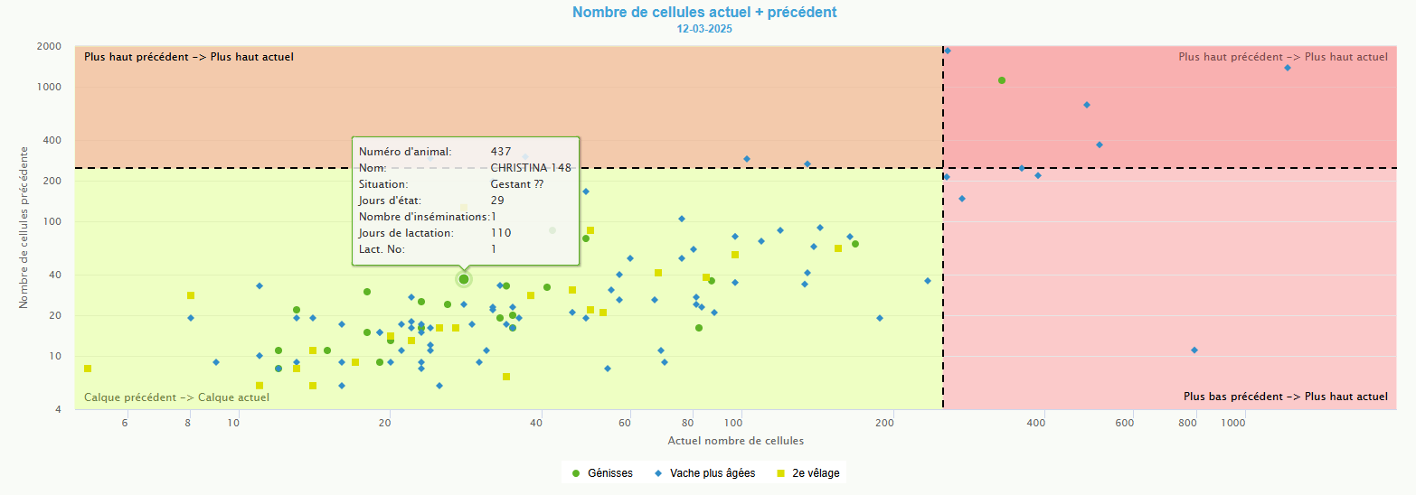 Sous Analyse & rapports - Santé d'animal - Analyse de la mamelle - 02. Nombre de cellules actuel + précédent, il est possible de récupérer un graphique montrant le comptage cellulaire des animaux du MPR actuel par rapport au MPRprécédent.