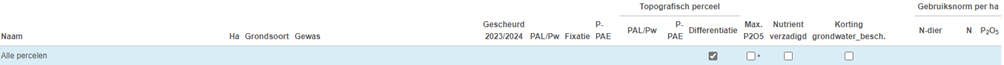 Per perceel kunt u aangeven of het perceel Gescheurd, fixatie, differentiatie, max P2O5 is, Nutriënt verzadigd of korting grondwater beschikbaar.