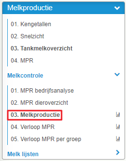 Onder het kopje Melkproductie staat ook een subkopje Melkcontrole waaronder 03. Melkcontrole staat.