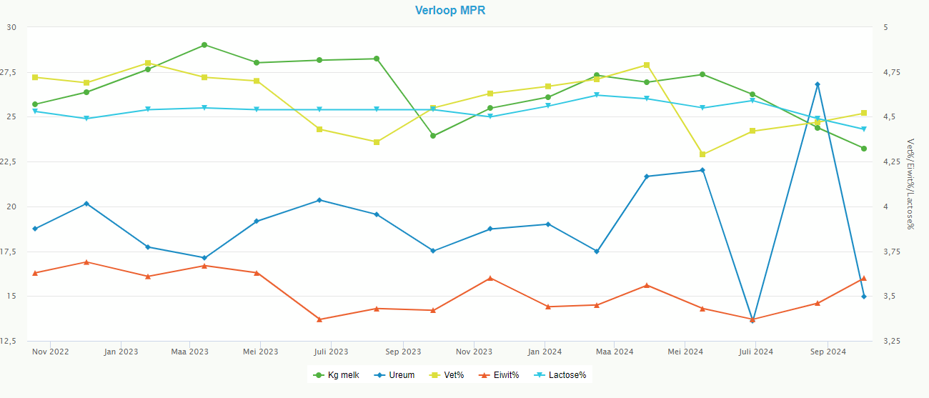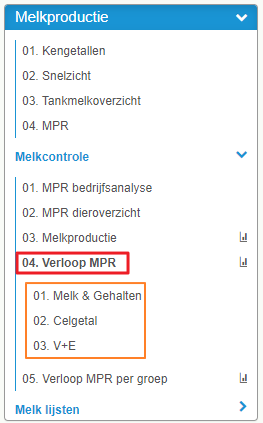 Onder het kopje Verloop MPR staan nog 3 subgrafieken: Melk & gehalten, Celgetal en V+E.
