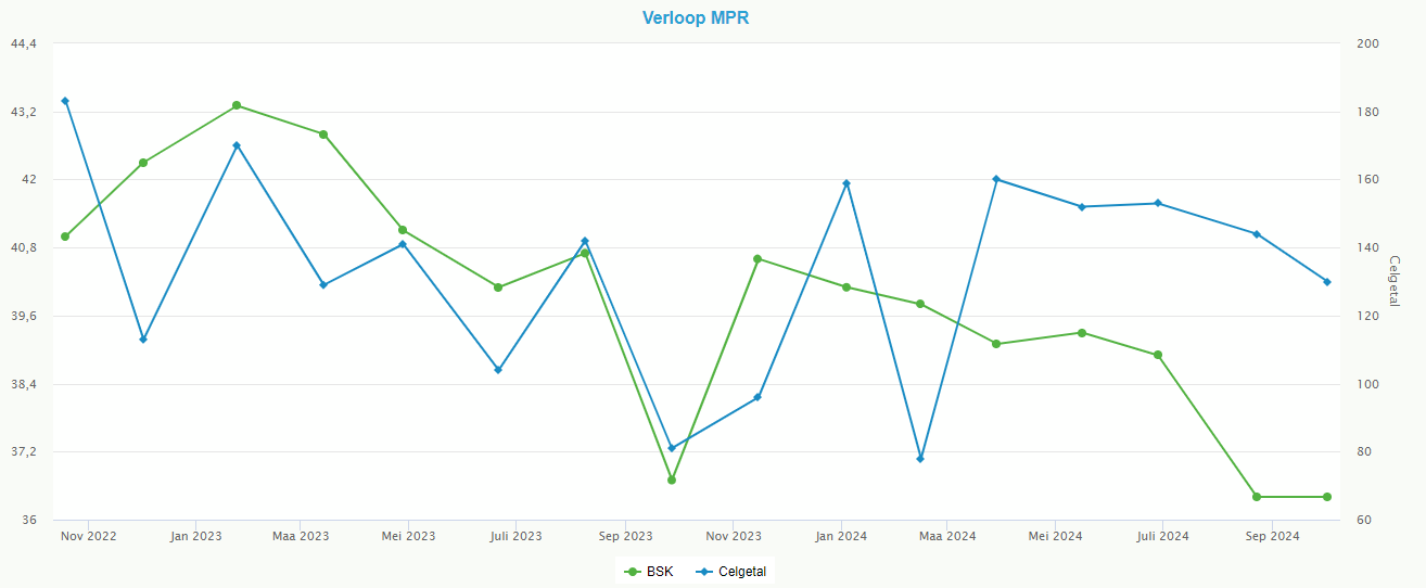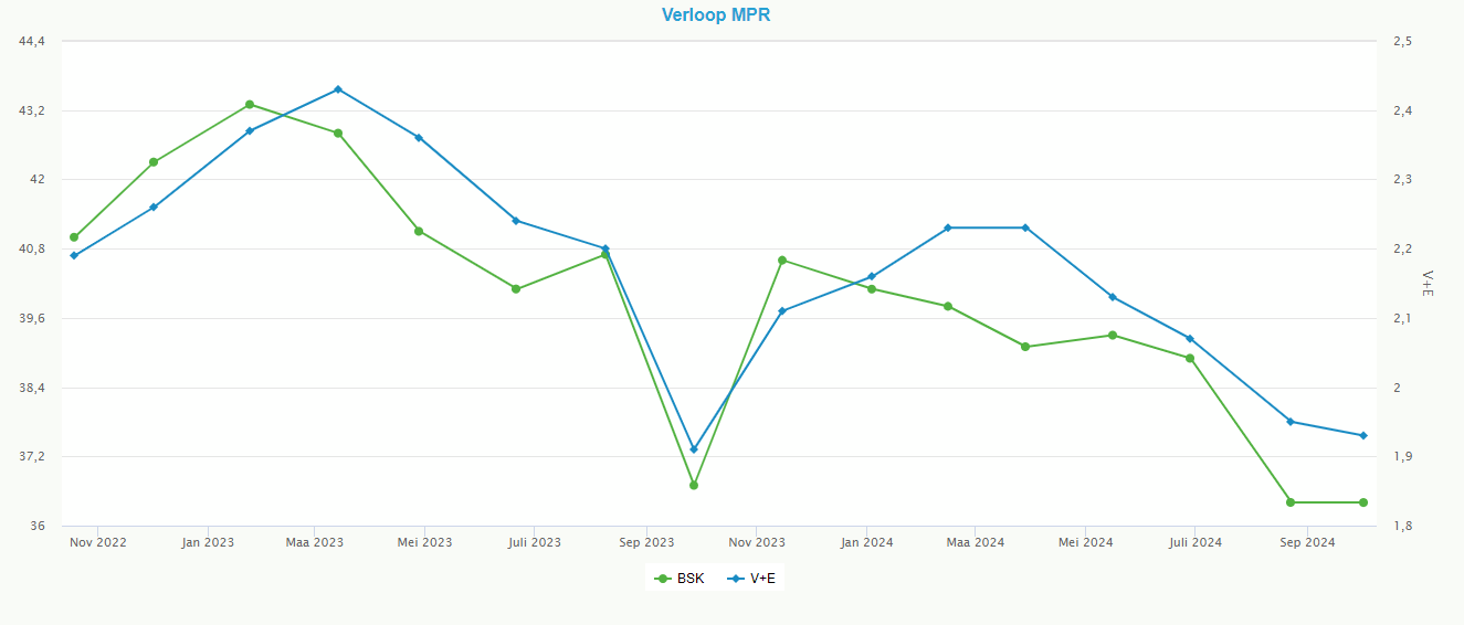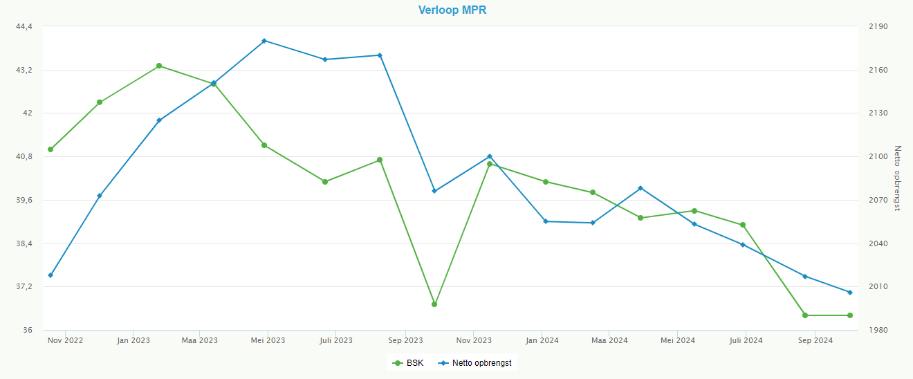 De verloop van de MPR is een grafiek op te vragen onder Melkcontrole. In de Verloop MPR is de BSK en Netto opbrengst in te zien van de afgelopen 2 jaar op het moment van opvragen.