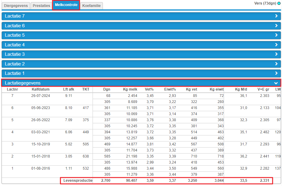 Wanneer u naar de Koekaart gaat van een dier, vervolgens gaat naar Melkcontrole en onder het kopje lactatiegegevens staat er een Levensproductieregel.