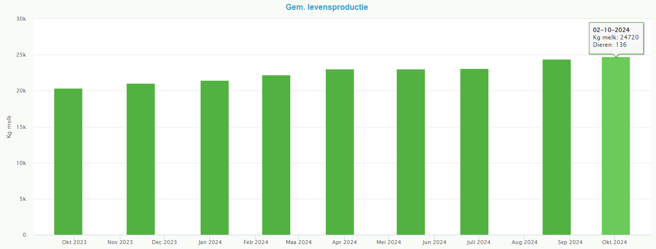Wanneer u met uw muis over de staaf gaat, zal de MPR datum, de gemiddelde kg melk aan levensproductie en het aantal dieren zichtbaar worden.