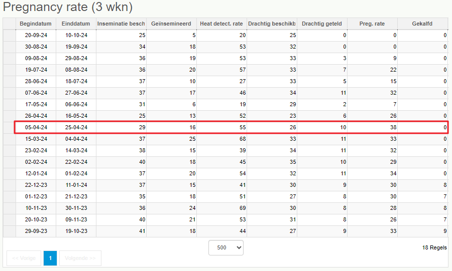 Onder Reproductie - Dracht- 01. Pregnancy rate staat een rapport met daarop de gemeten pregnancy rate op basis van een 3 weken periode.