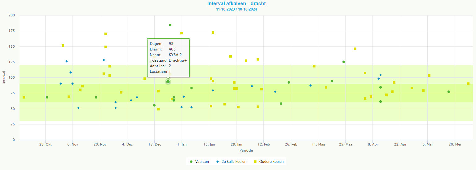 Door met de muis over de figuurtjes (rondjes, ruitjes, vierkantjes) te gaan, zal het diernummer, het aantal dagen interval, de kalenderstatus en vruchtbaarheidsgebeurtenissen zichtbaar worden.