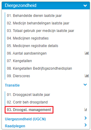 Onder Dieranalyse - Diergezondheid - Transititie - 03. Droogstand management staat in grafiek die weergeeft of een droogstandsbehandelingen de juiste zijn geweest per dier.