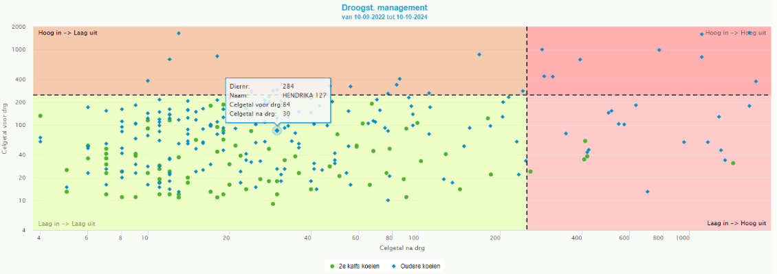 Door met de muis over de figuurtjes (rondjes, ruitjes) te gaan, zal het diernummer, celgetal voor droogzetten en het celgetal na droogzetten worden getoond. Door op een van de 4 vlakken te klikken zullen de dieren in beeld komen die in dat vlak vallen. Het is mogelijk om dat overzicht te printen of als PDF op te slaan.