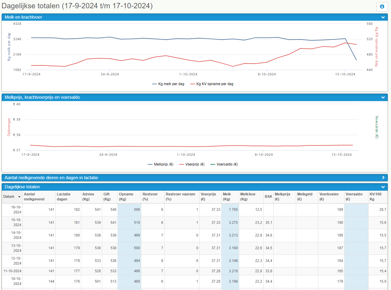 De grafiek 03. Dagelijkse totalen geeft in een tabel per dag de voer- en melkgegevens weer van alle dieren. De gegevens gedetailleerd weergegeven zijn het krachtvoeradvies, de krachtvoergift, de krachtvoeropname en het % restvoer. Verder wordt ook de totale melkgift van de dag en het melk/koe weergegeven.
