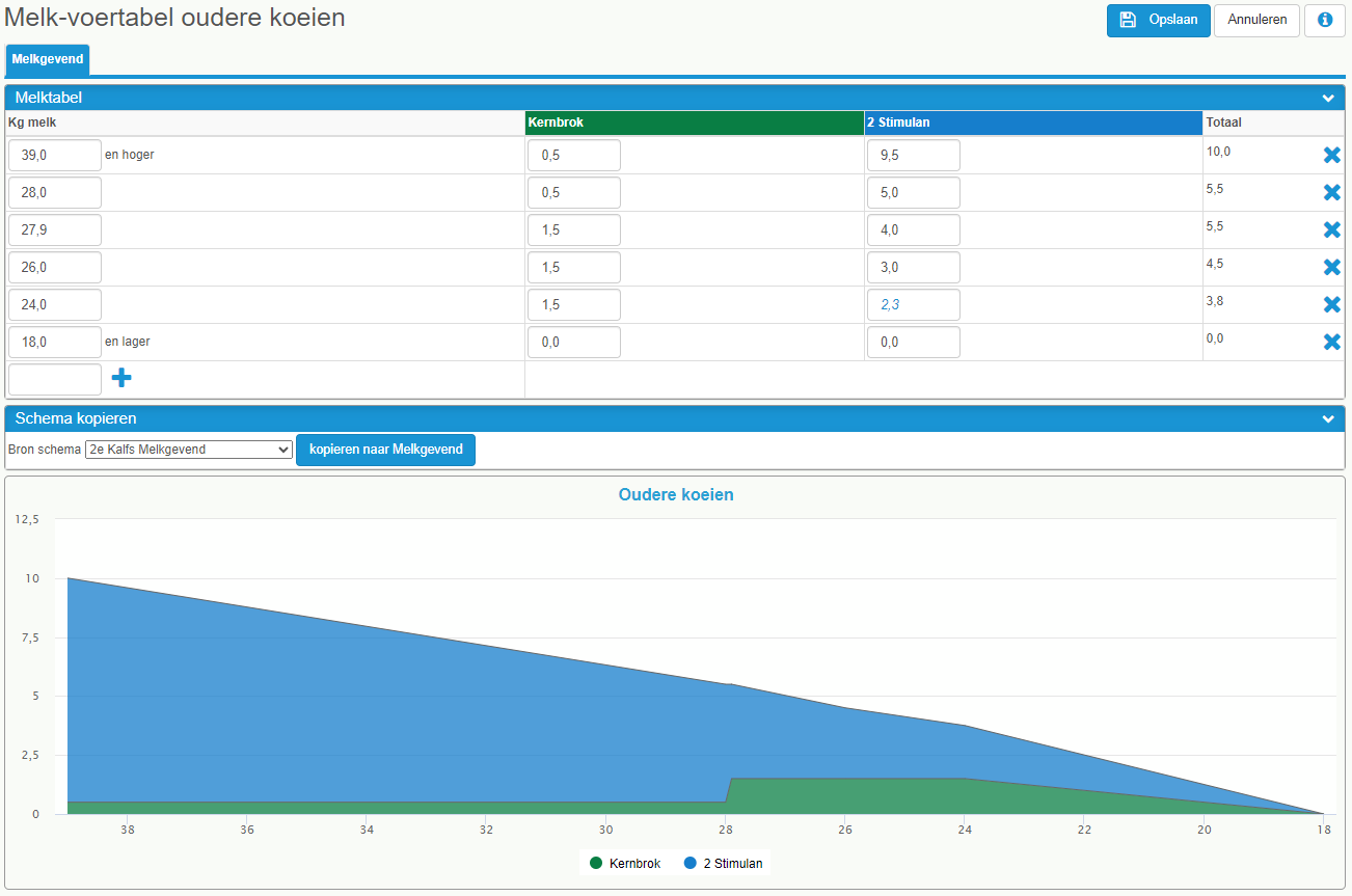 De melktabel kan ingesteld worden op basis van kg melk. Per kg melk kan er dan een gewenste voergift ingevuld worden.