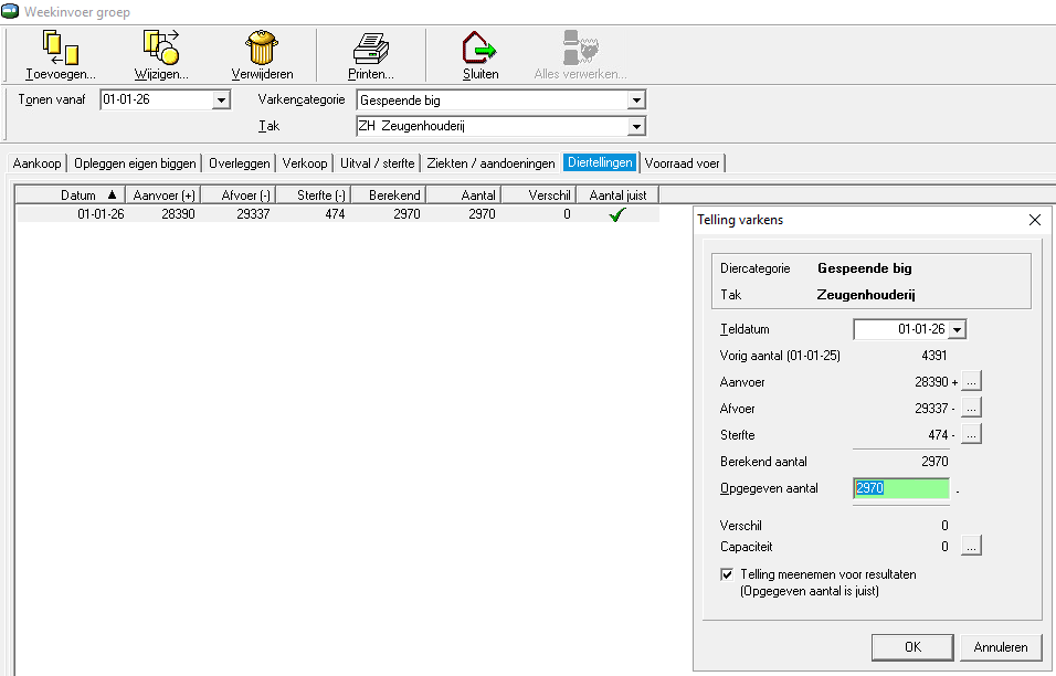 Voer de teldatum en het aantal in wat aan het begin van de dag (0.01 uur) aanwezig was