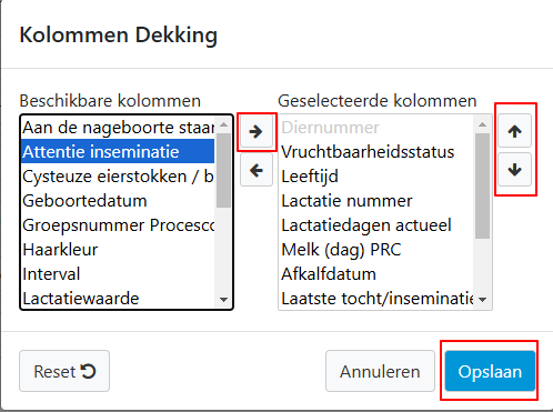 U kunt hier de kolom attentie inseminatie kiezen bij beschikbare kolommen en dan met de pijltjestoets naar de geselecteerde kolommen slepen. Als deze daar staat, kunt u de volgorde van de kolommen aanpassen door deze naar boven of naar beneden te plaatsen.