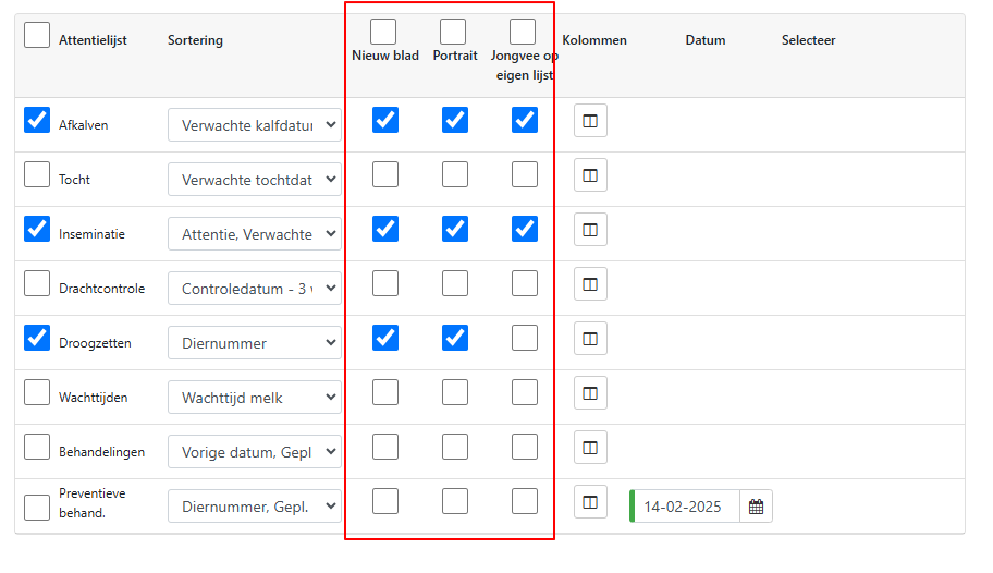 Naast de sortering heeft u nog meerdere keuzeopties, namelijk nieuw blad, portrait en jongvee op eigen lijst.