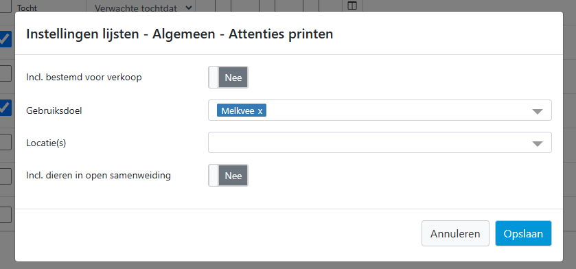 Hier kunt u nog kiezen of u dieren die bestemd zijn voor verkoop op de lijst wilt hebben, welk gebruiksdoel of locatie er getoond moet worden (als dit leeg is dan worden alle gebruiksdoelen en/of locaties getoond die aanwezig zijn in het programma) en of u de dieren inclusief open samenweiding op de lijst wilt hebben.