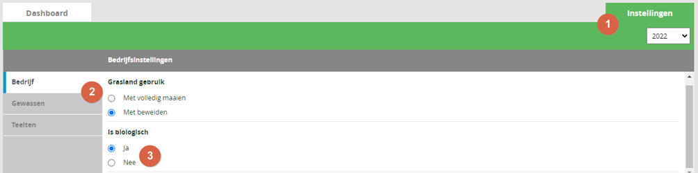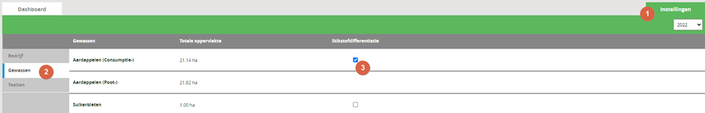 Via de knop het Instellingen (1), Gewassen (2) kunt u doormiddel van een vinkje (3) aangeven voor welke gewassen stikstofdifferentiatie moet worden gehanteerd.